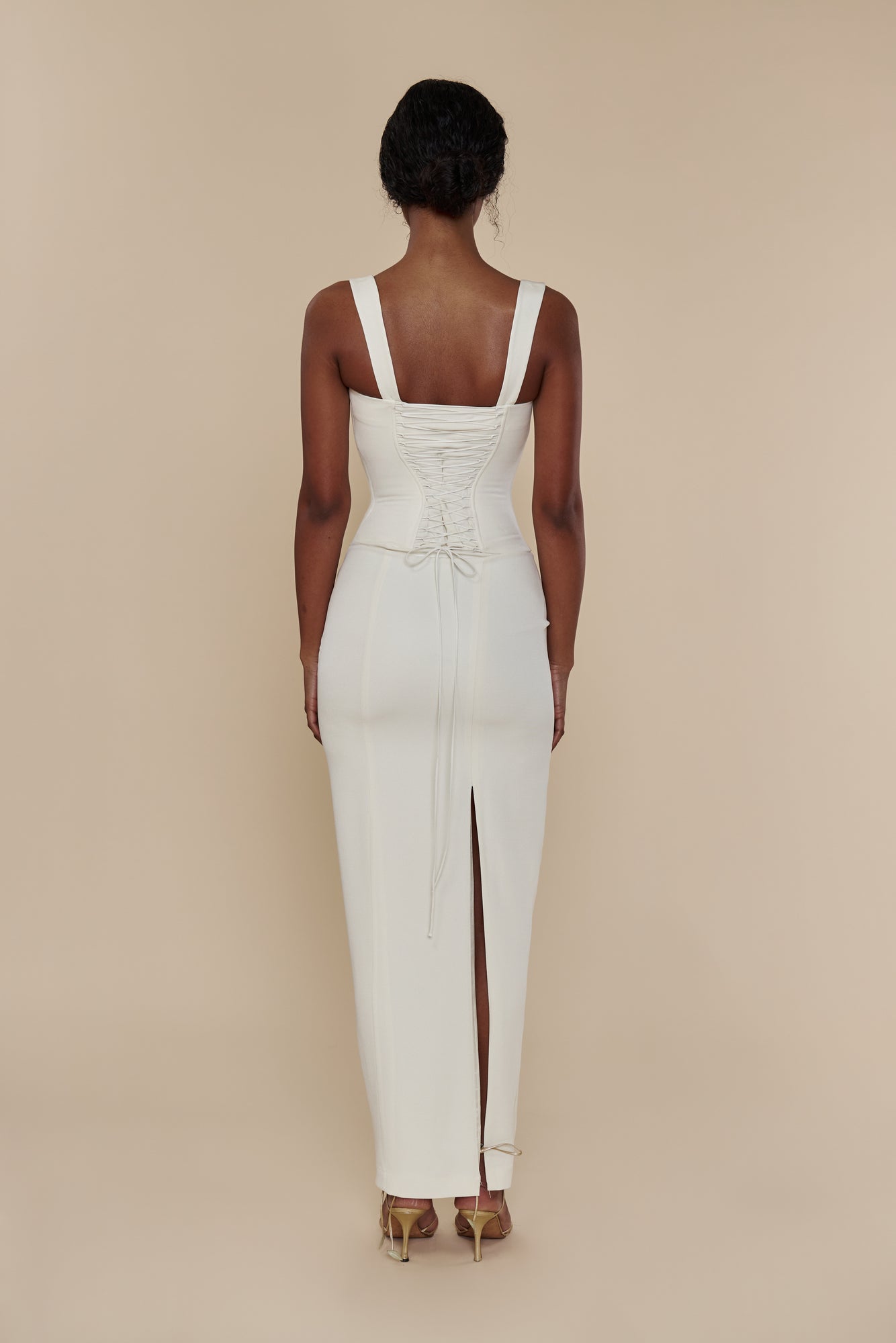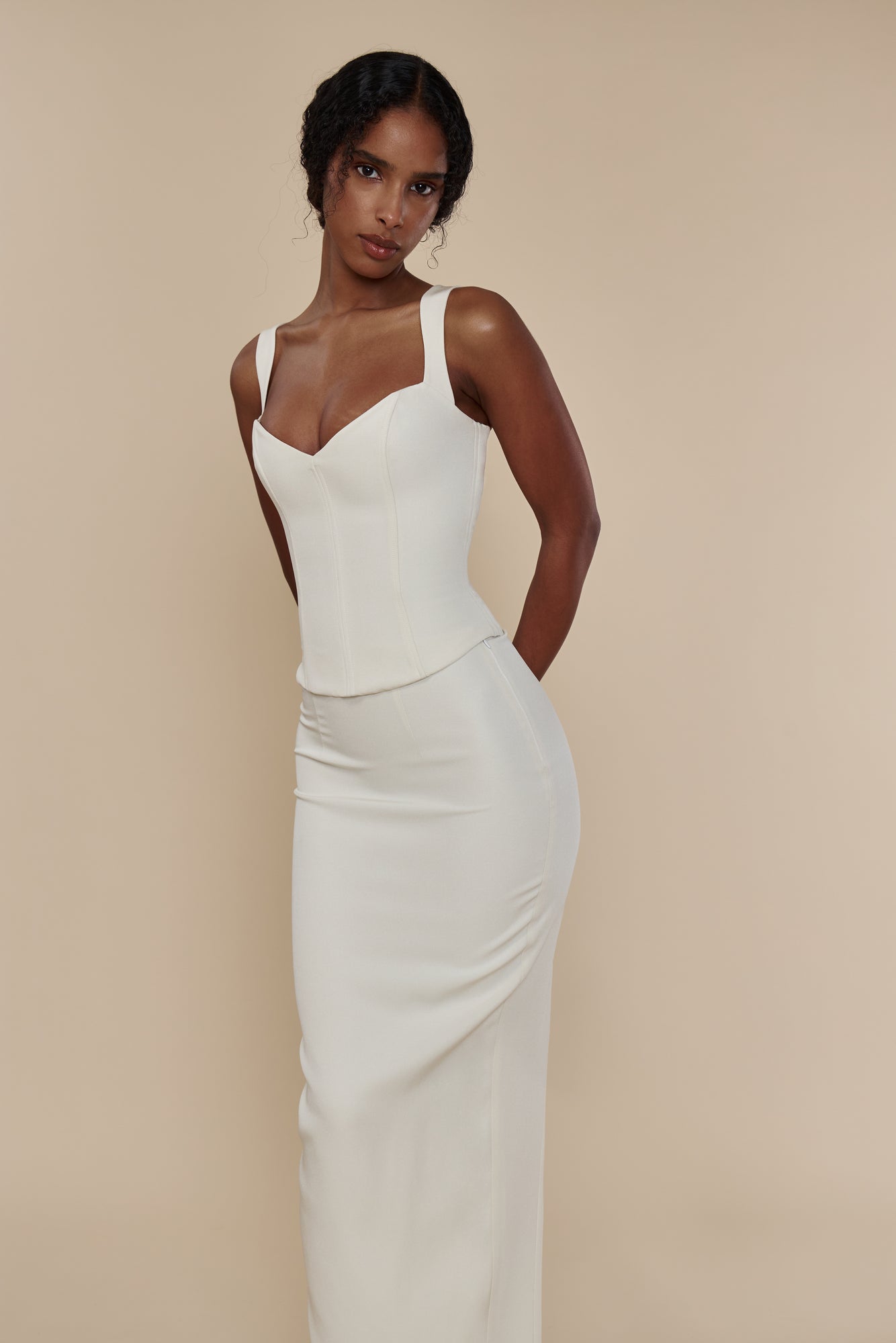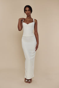 Designed and proudly made in New York City, USA. The Artemis Skirt is made on the matte side of Crepe Back Satin. This mid waist, column skirt hits just below the ankle to elongate the leg and offers a side back slit for mobility. It has an invisible zipper at the side seam with a hook and eye closure on top. Shown with the Artemis Bustier. This made-to-order style is expected to ship within 3-4 months. Find out more here.