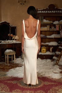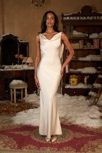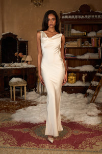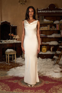 - Designed in New York City and proudly made in Shenzhen, China. Plunging back cowl gown can we worn in a variety of ways and has functional ties at the back of the neck and silk buttons at the waist. Shop all Plunging Back Cowl colorways here.