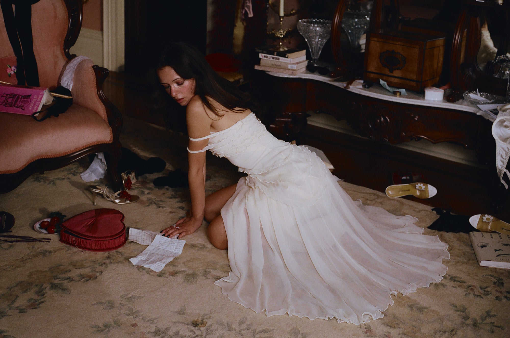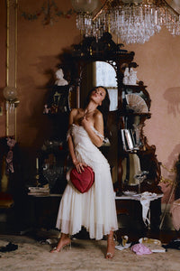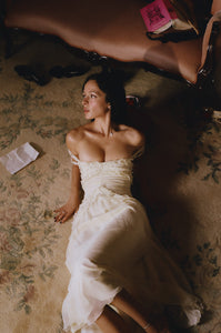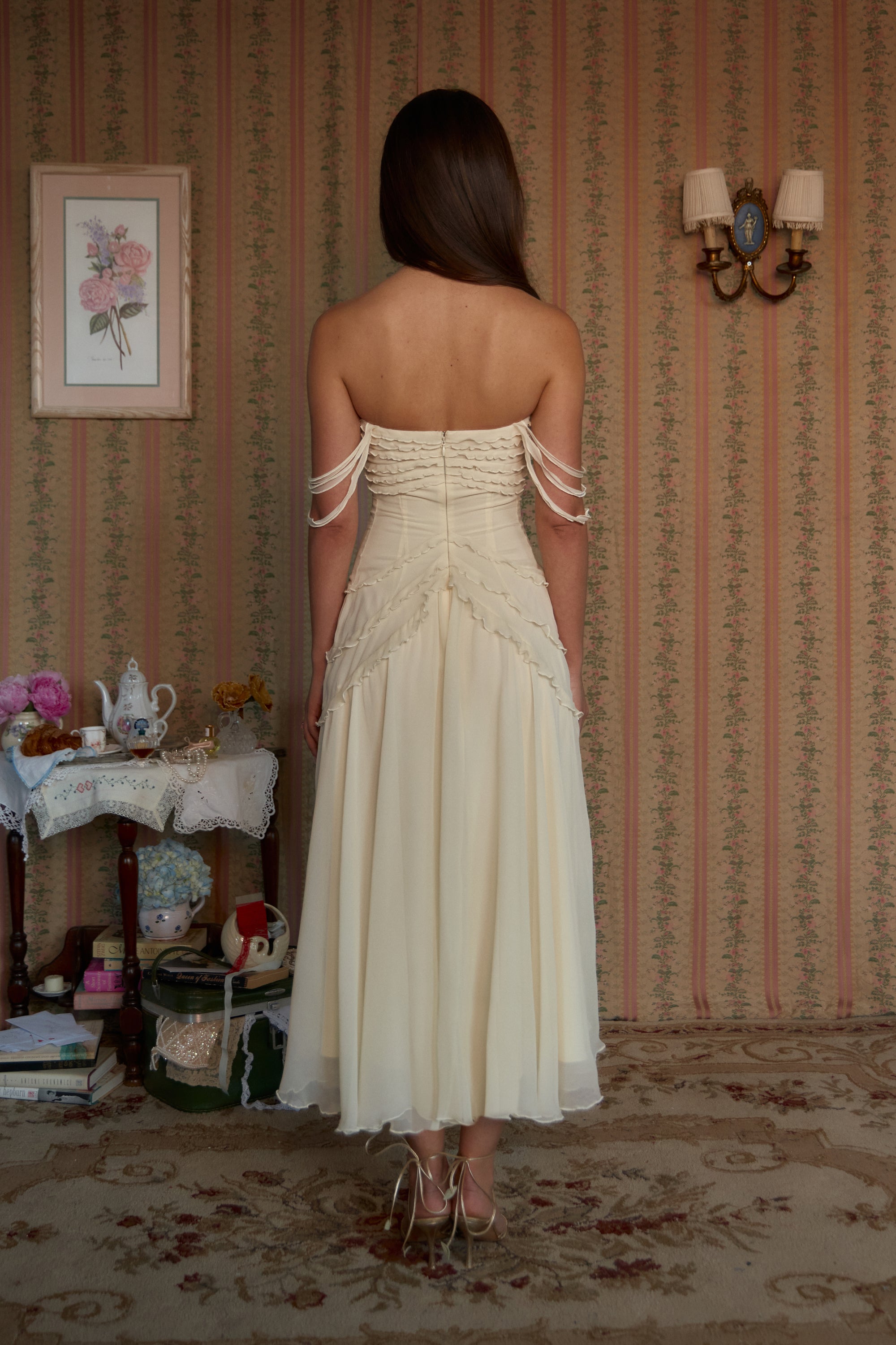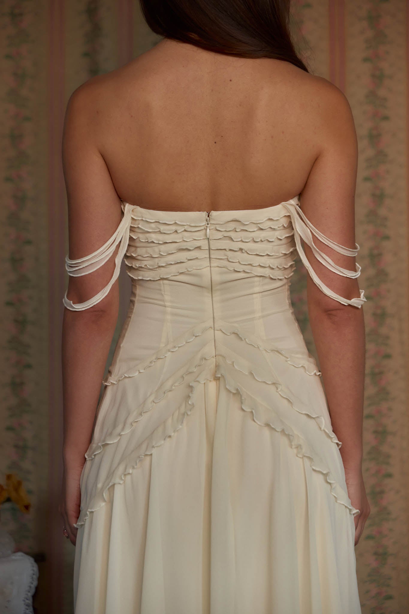Designed in New York City and proudly made in Shenzhen, China. A silk chiffon cascading ruffle lady length dress featuring an invisible zipper at the center back with a hook-and-eye closure at the top. Designed with silicone elastic along the top edge for a secure fit, and finished with cascading ruffles adorned with a pearl edge. It is intended to be worn strapless. Dresses cut on bias vary in length. This made-to-order style is expected to ship within 3-4 months. Find out more here.