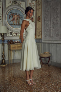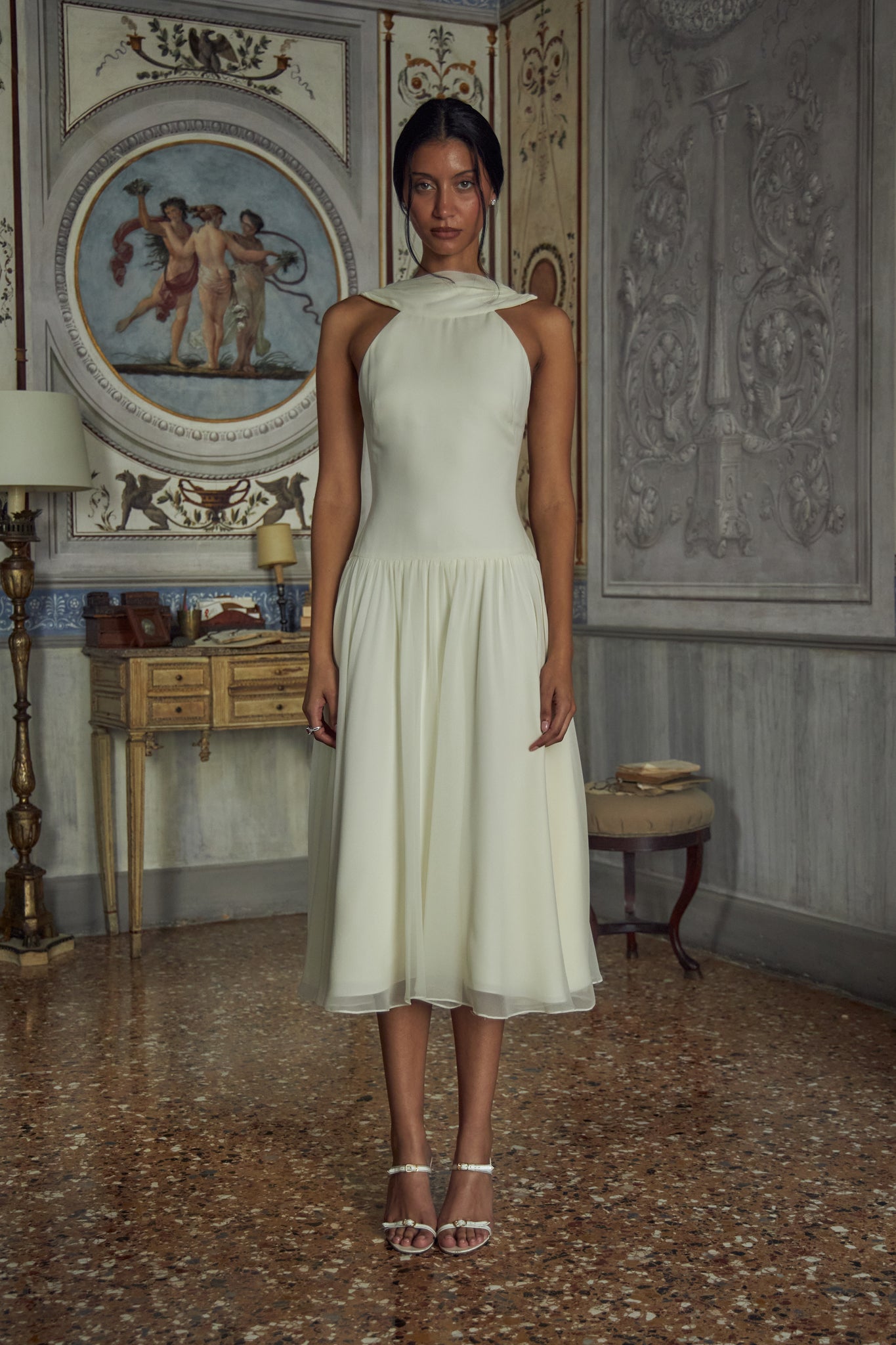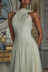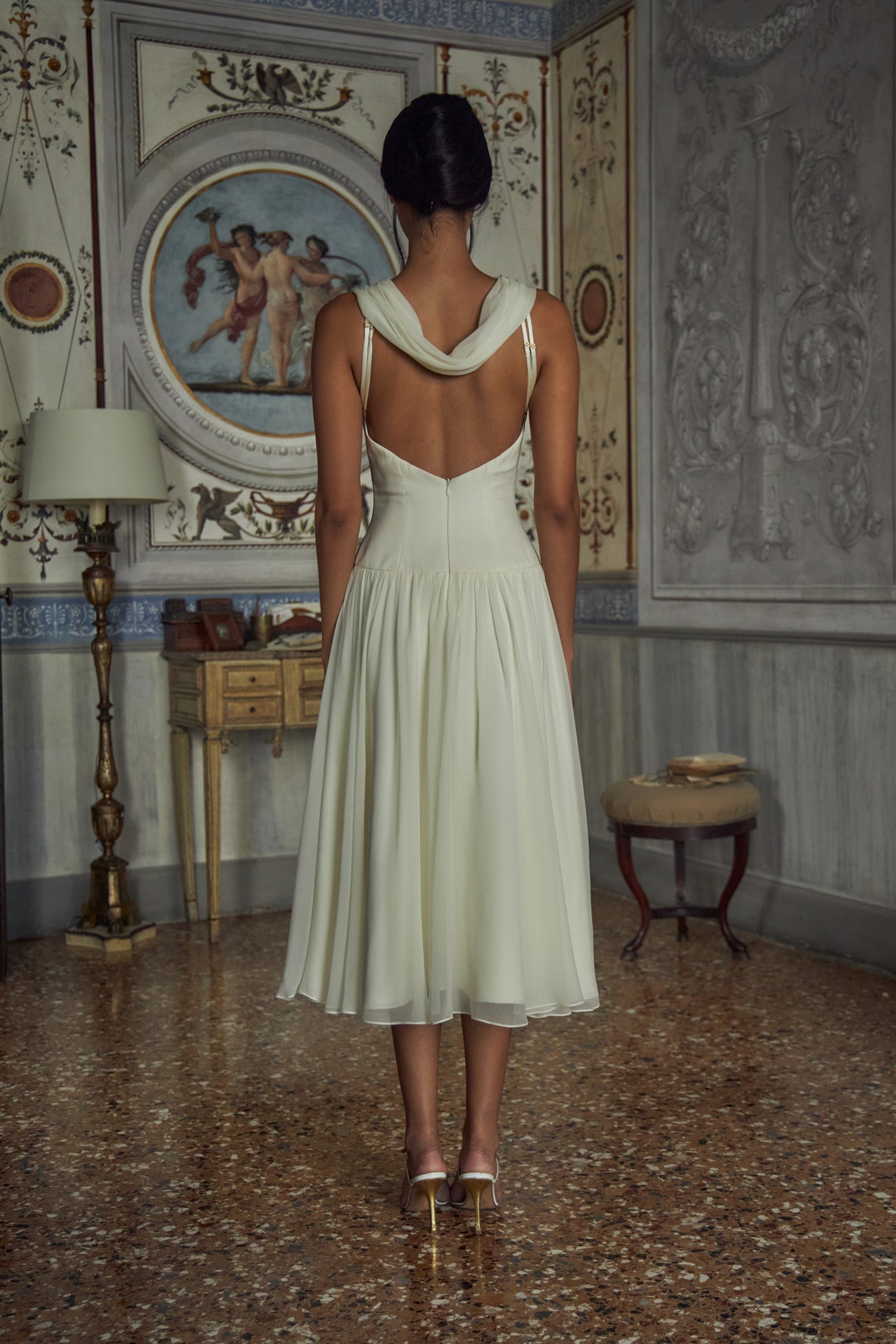 Designed in New York City and proudly made in Shenzhen, China. Drop waist lady length dress with cowl neckline in the front and back. Shirred, double lined skirt. Invisible zipper and hook-and-eye closure at center back. Back cowl attached to adjustable straps with ring and sliders.