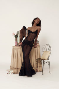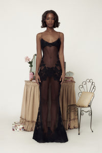 Designed in New York City and proudly made in Delhi, India. Illusion tulle gown adorned with hand cut and sewn lace appliqués along neckline, hip and hem. Hem is reinforced with horsehair. Laces imported from France. Hook-and-eye closure. Comes with removable lining.