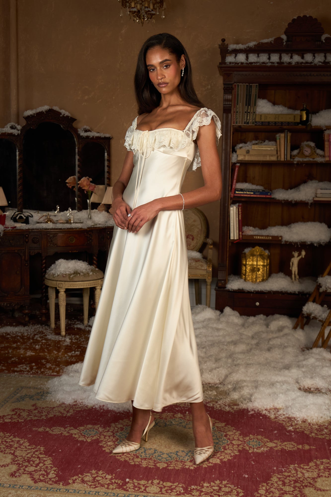 - Designed in New York City and proudly made in Shenzhen, China. An off the shoulder bias cut dress with a lace trim along the neckline and a ballet length skirt. Features silicone gripper elastic along the inside edge and boning on upper bodice. Invisible zipper and hook-and-eye closure at the center back. Elastic on the shoulders.
