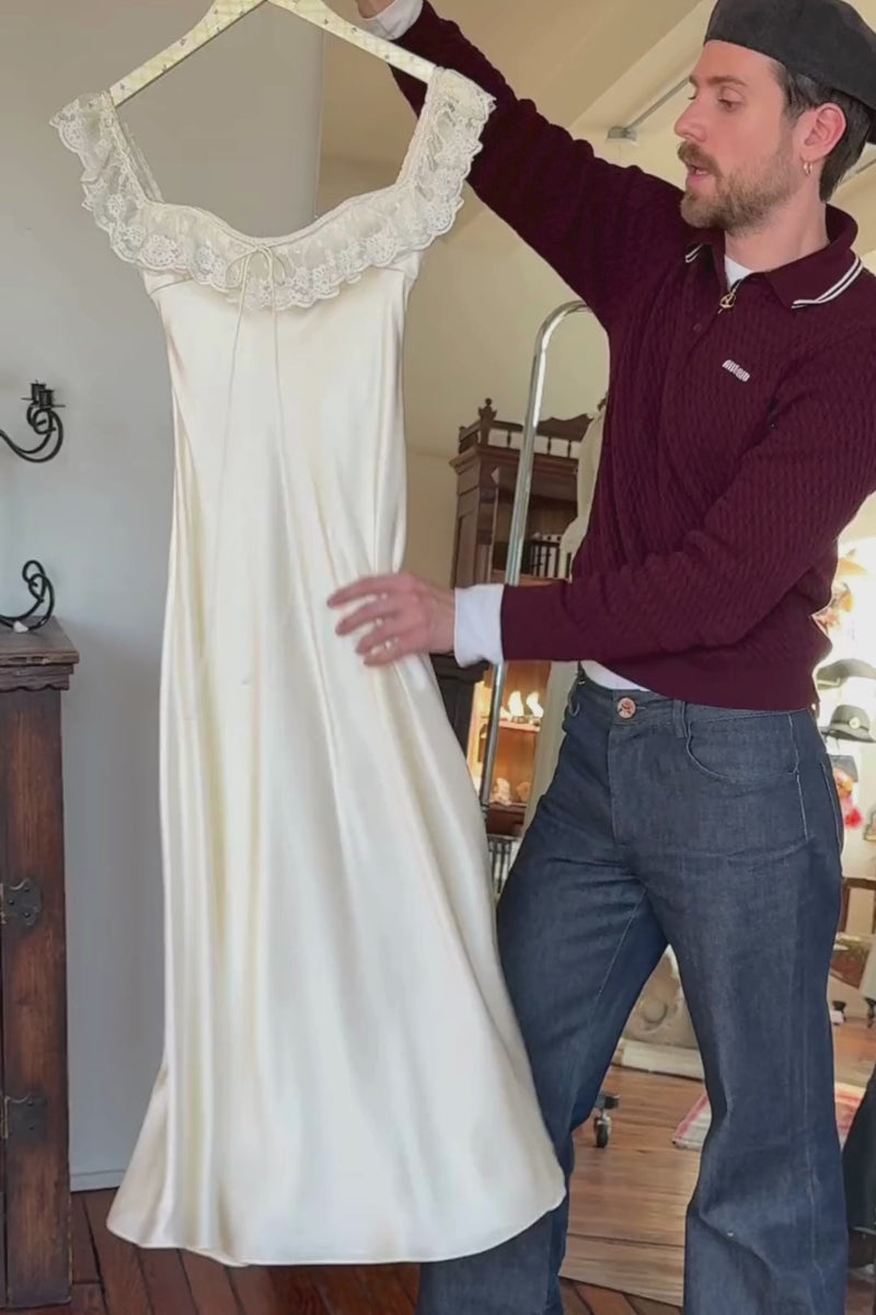- Self: 100% Silk Charmeuse, Lining: 100% Silk Habotai. Lace Trim 1: 100% Cotton, Lace Trim 2: 65% Nylon, 35% Cotton. Dry Clean only.