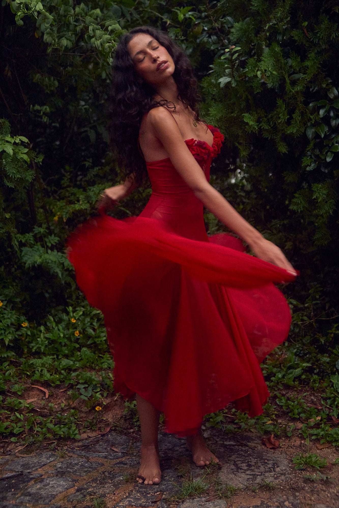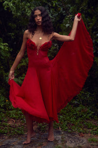 - Designed and proudly made in Jiaxing, China. A scarlet silk chiffon sheer dress featuring meticulously handcrafted floral detailing, individually placed on the bust. Complemented by 1/8-inch scarlet chiffon crisscrossed straps at the center of the bust. Each dress showcases a unique motif, reminiscent of a bouquet of roses you receive once a week. *Shades of red may vary due to dye lots.* Dress comes complete with a separate lining and can be worn with or without. Dresses cut on bias vary in length. Also available in Butter and Noir. This item is expected to ship between February 23rd - 27th.