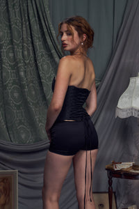 - Designed in New York City and proudly made in Shenzhen, China. Poly taffeta corset with boning throughout, poly taffeta loops, silk charmeuse ties and smocked back.