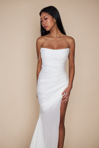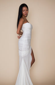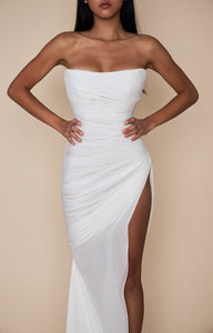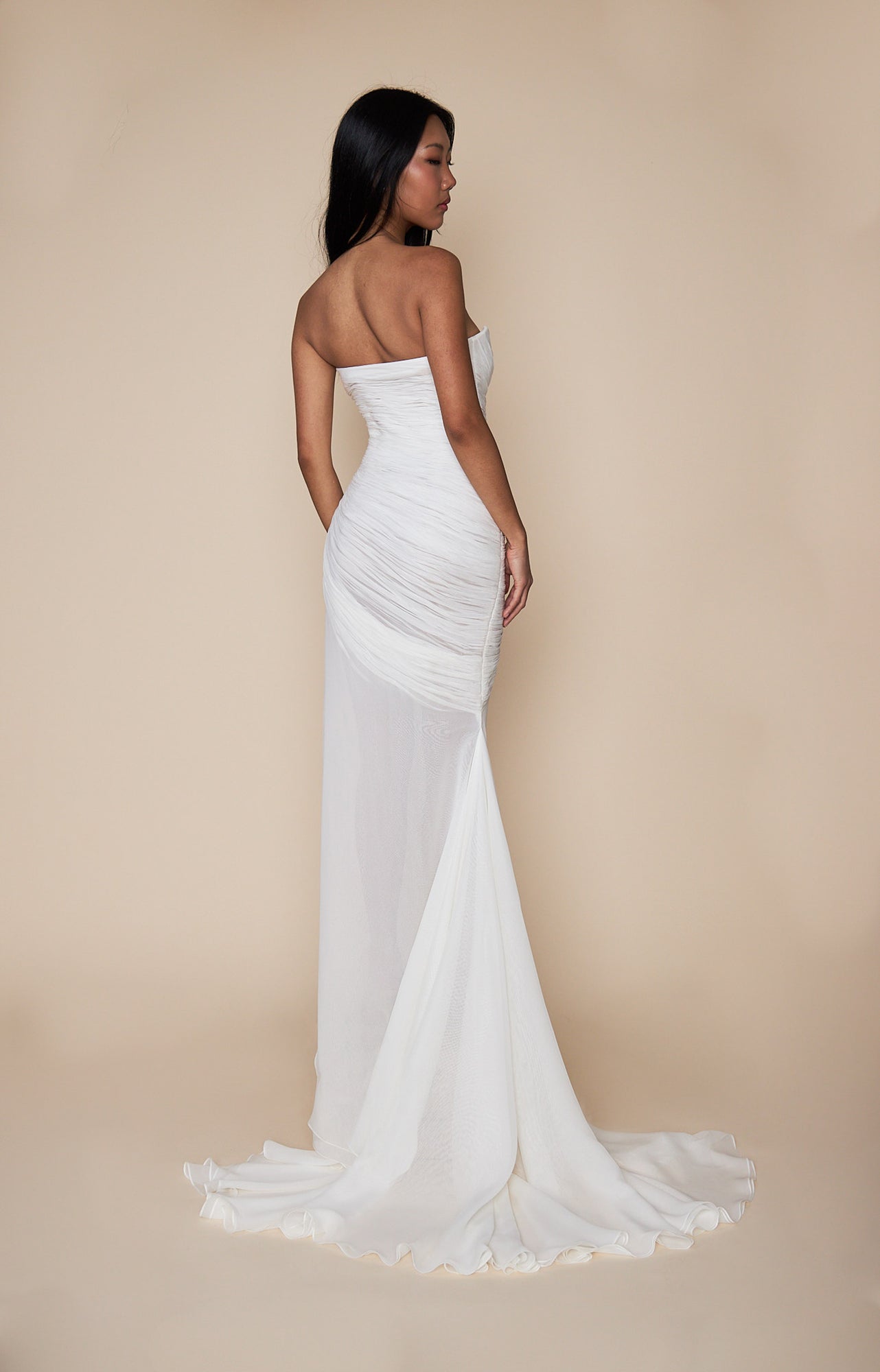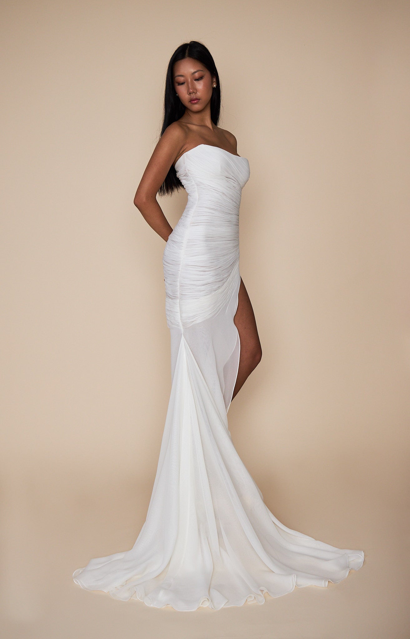 - Designed and proudly made in New Jersey, USA. The Angel of Morning Gown creates the illusion of wet chiffon and is inspired by Grecian drapery. It is made of 100% silk chiffon and has a built in corset to cinch the waist and support the body. The dress has two sets of removable straps, one set in white and the set in clear. This made-to-order style is expected to ship within 3-4 months. Find out more here.