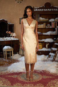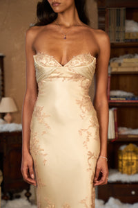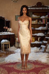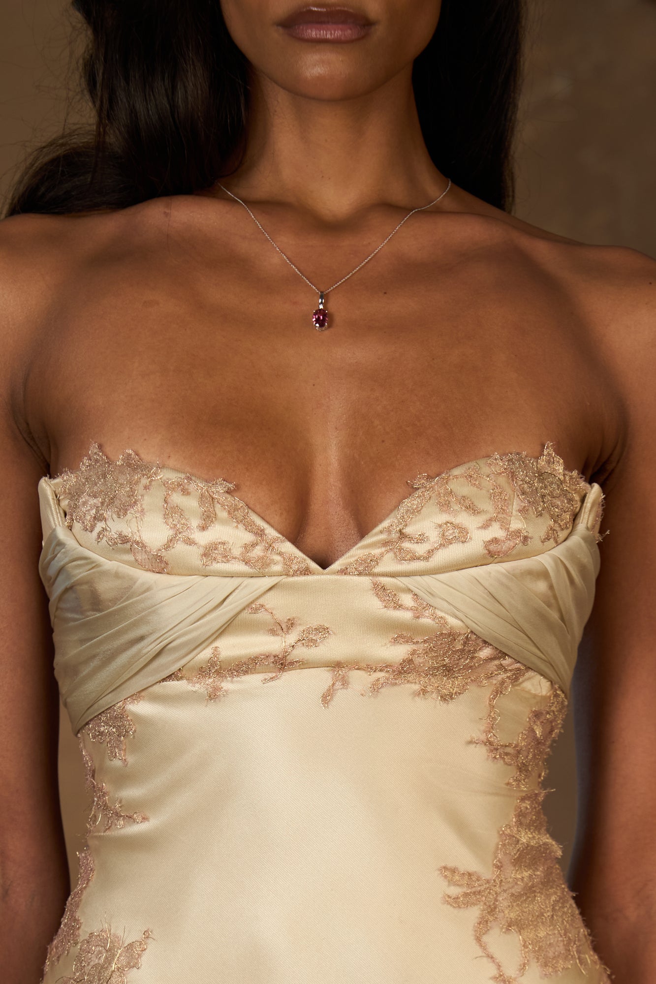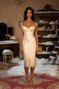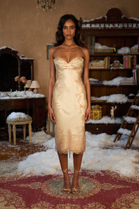 Designed in New York City and proudly made in Shenzhen, China. This stunning lady dress comes with tulle overlay and lace trim on the underbust, along the side seams and hem, as well as silk ties attached at the underbust seam for many different ways of styling. Features a built in corselette with removable bra cups and hook-and-eye bra strap closures for security. Also has adjustable and removable straps and a hook-and-eye closure on top of invisible zipper at the back. This made-to-order style is expected to ship within 3-4 months. Find out more here.