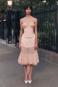 - Designed in New York City and proudly made in Shenzhen, China. A versatile bustier with adjustable straps to be style however you desire. Features hand sewn lace and removable bra cups. Comes with hook-and-eye closures at the side seam, steel boning in the bodice and silk ties at the back.