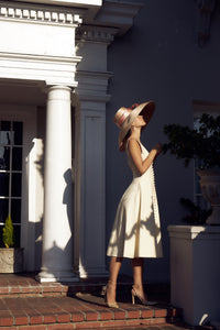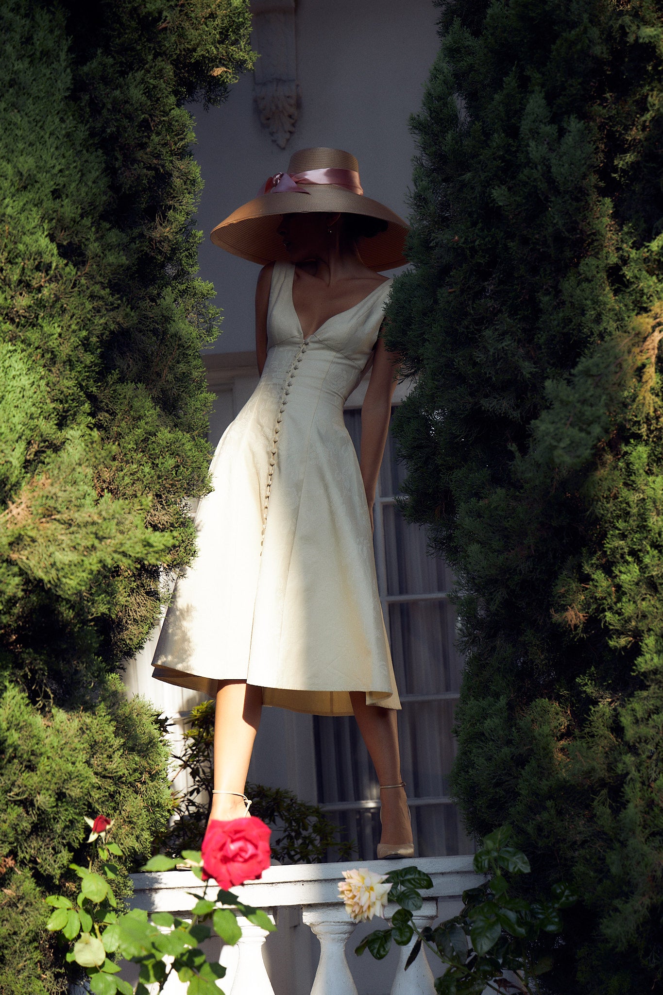 Designed in New York City and proudly made in Shenzhen, China. Cotton jacquard v-neck dress with fully functional buttons and silk charmeuse loops for buttons. Hook and eye closure above buttons. A-Line silhouette with slight flare.