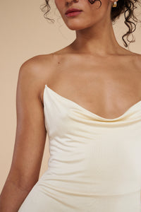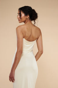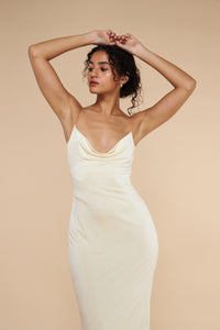 Designed and proudly made in New York City, USA. The Mirage Cowl Dress is a daring, body hugging silk knit jersey dress. The statuesque silhouette is a nod to Grecian simplicity and femininity. The dress features invisible straps, which creates a floating illusion on the wearers body. This made-to-order style is expected to ship within 3-4 months. Find out more here.