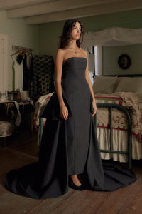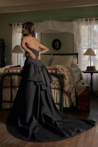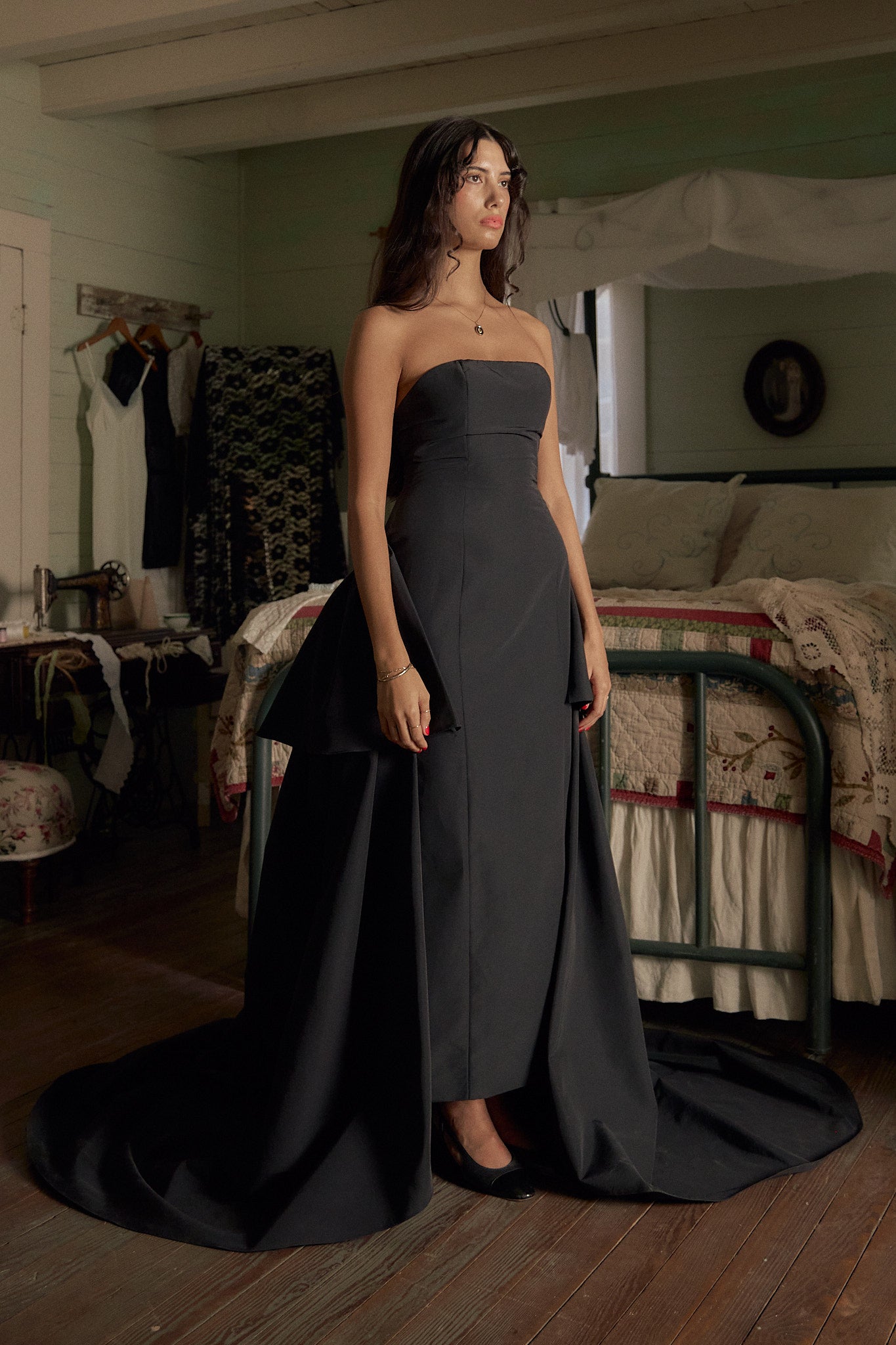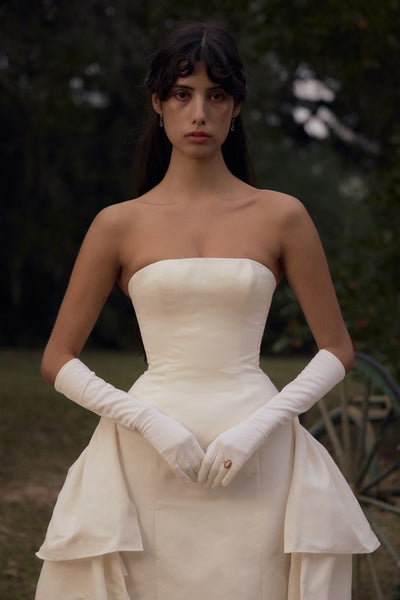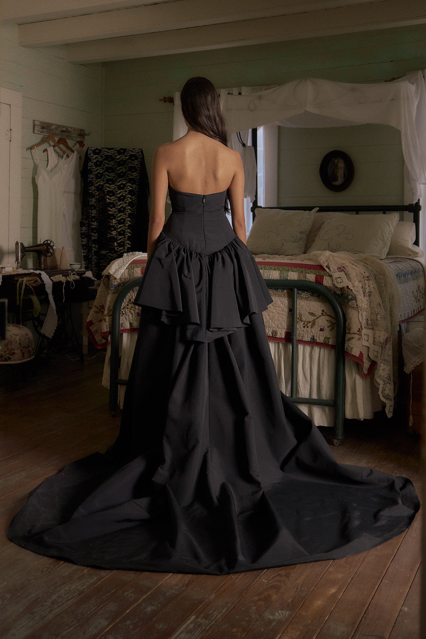 Designed and proudly made in New York City, USA. A strapless column gown structured with side bustles back peplum, built in corset and hip padding. Fully functional buttons over an invisible zipper down the center back. Buttons are covered in self and button loops make of self. Also available in Ivory. This made-to-order style is expected to ship within 3-4 months. Find out more here.