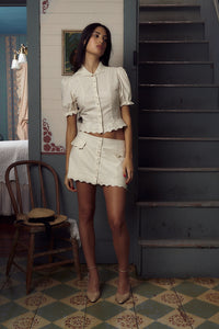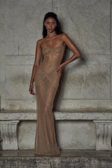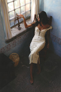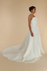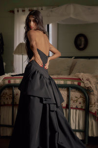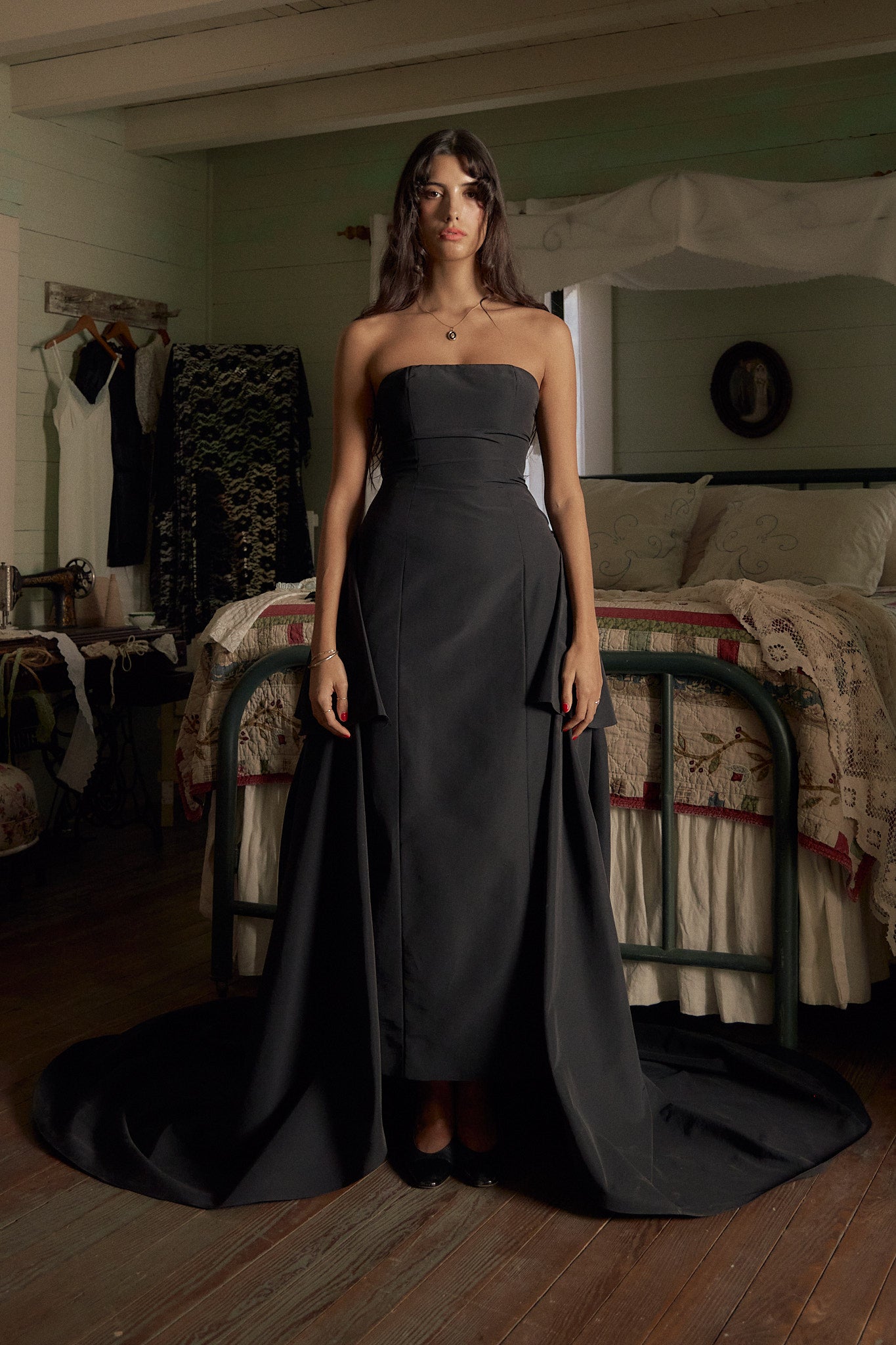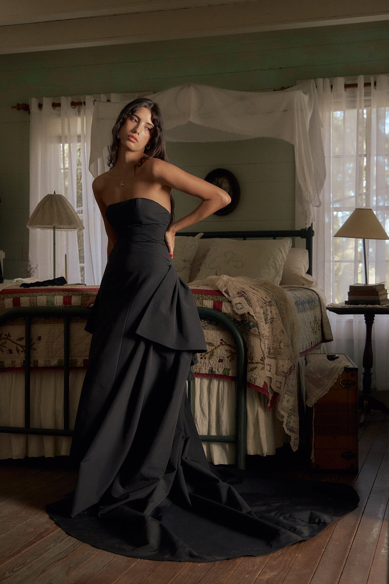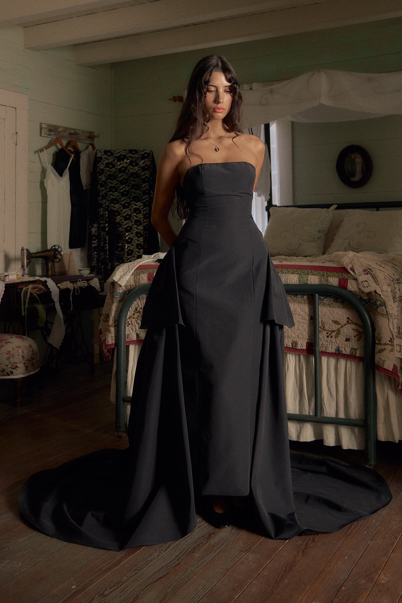 Designed and proudly made in New York City, USA. A strapless column gown structured with side bustles back peplum, built in corset and hip padding. Fully functional buttons over an invisible zipper down the center back. Buttons are covered in self and button loops make of self. Also available in Ivory. This made-to-order style is expected to ship within 3-4 months. Find out more here.