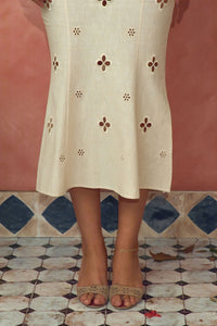 Fits true to size. Visit our size guide here. Due to the non-stretch silhouette of this dress, we recommend stepping into it rather than slipping it on over your head.