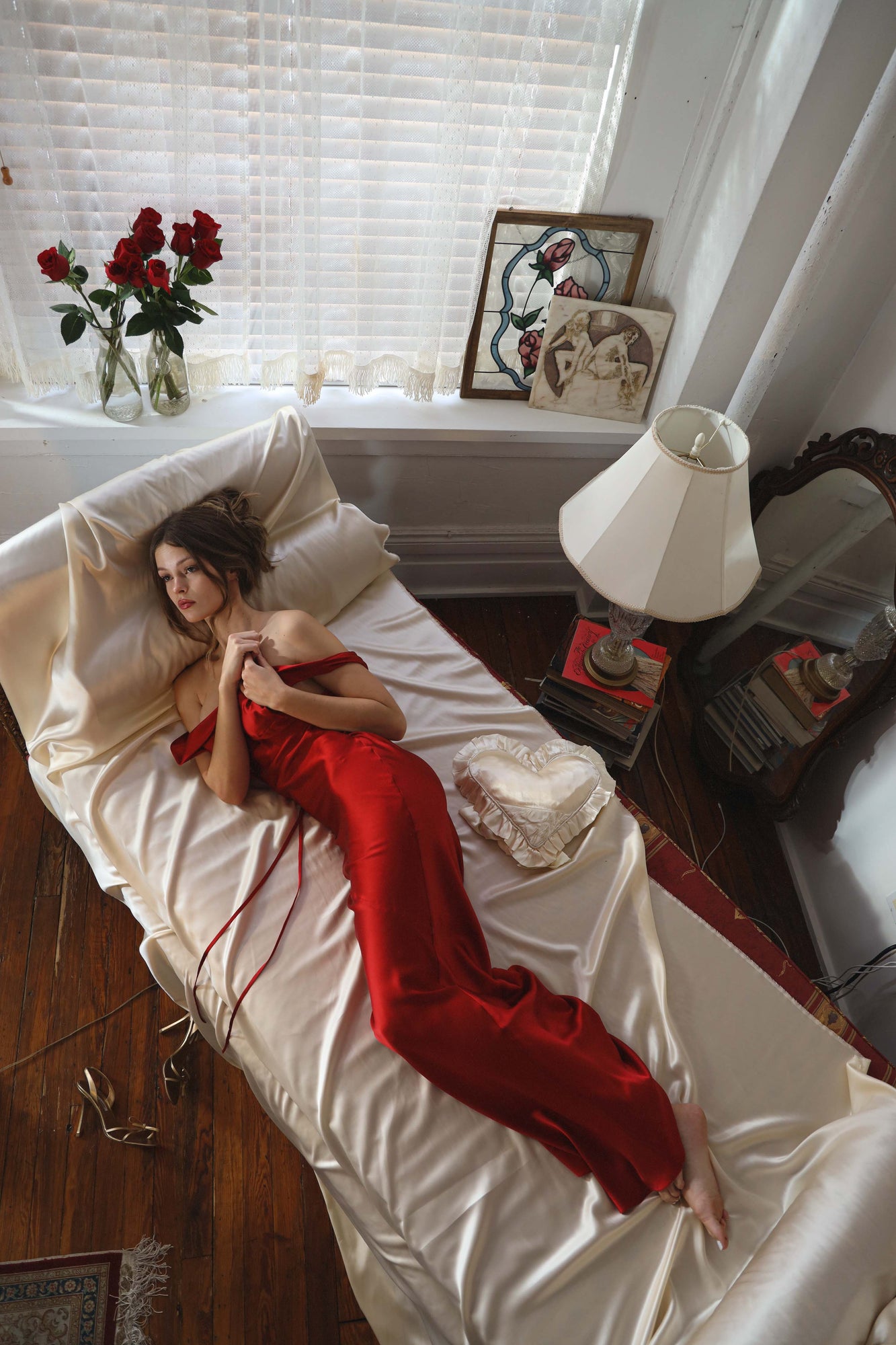100% Silk Charmeuse (dye lots may vary). Dry Clean Only.