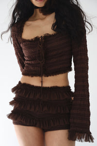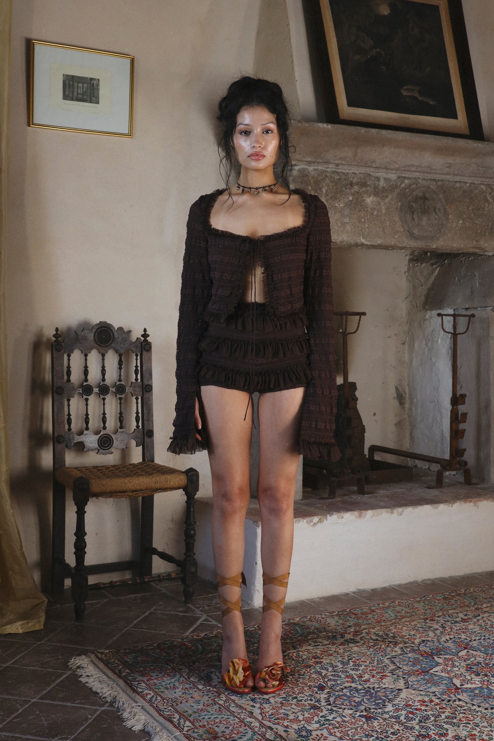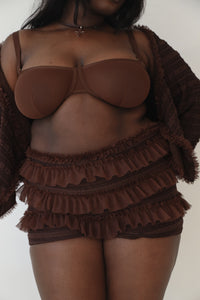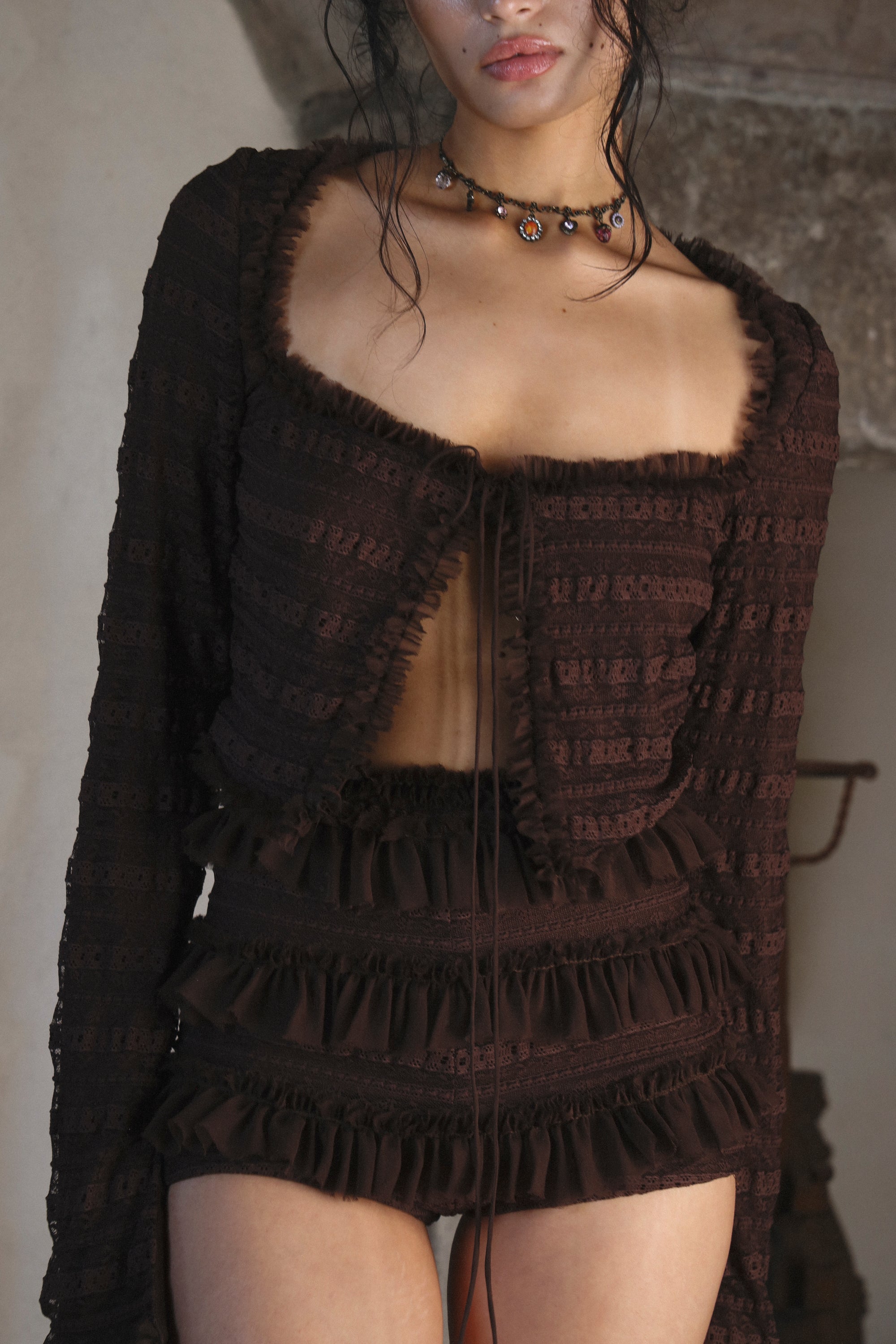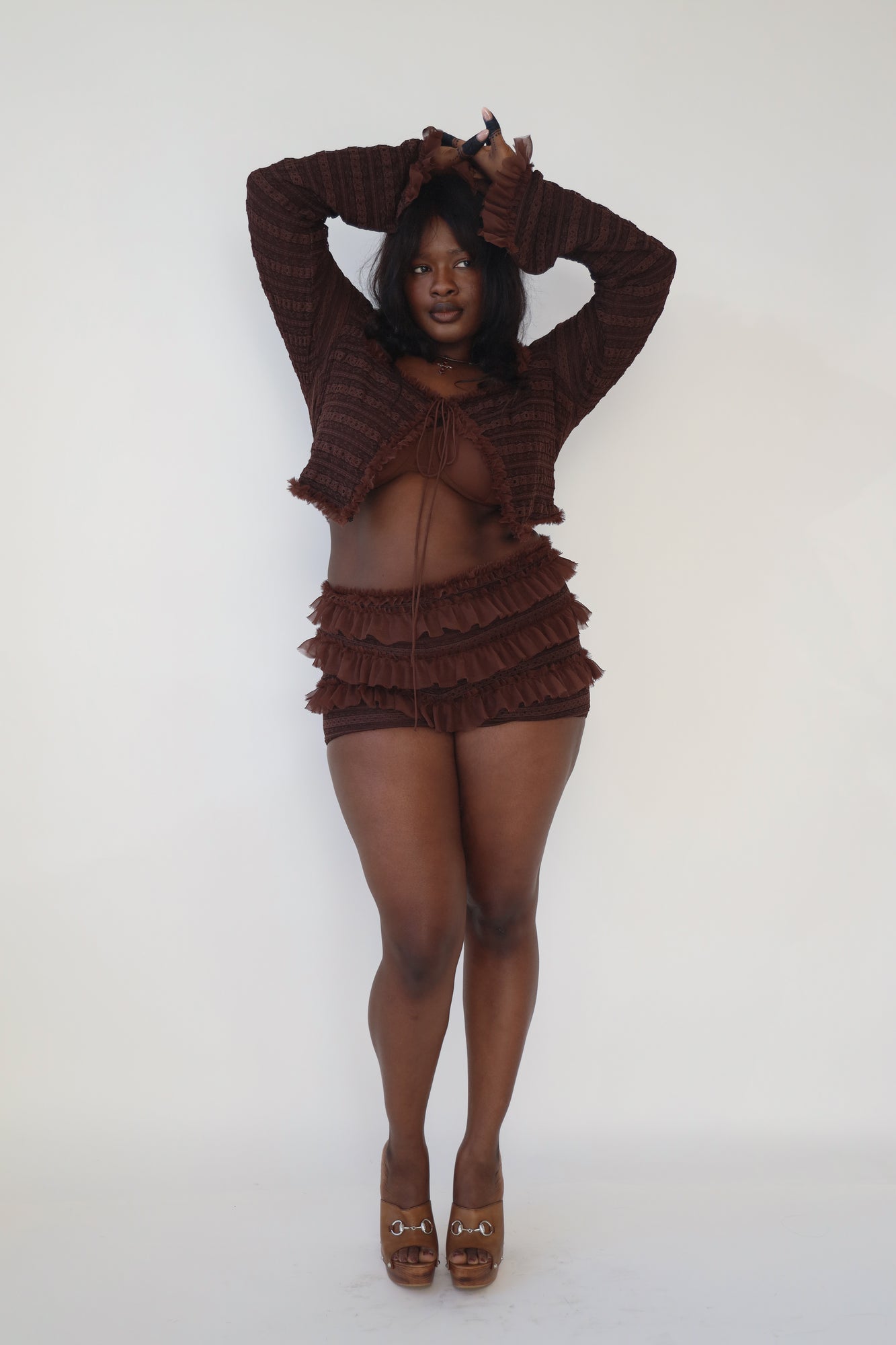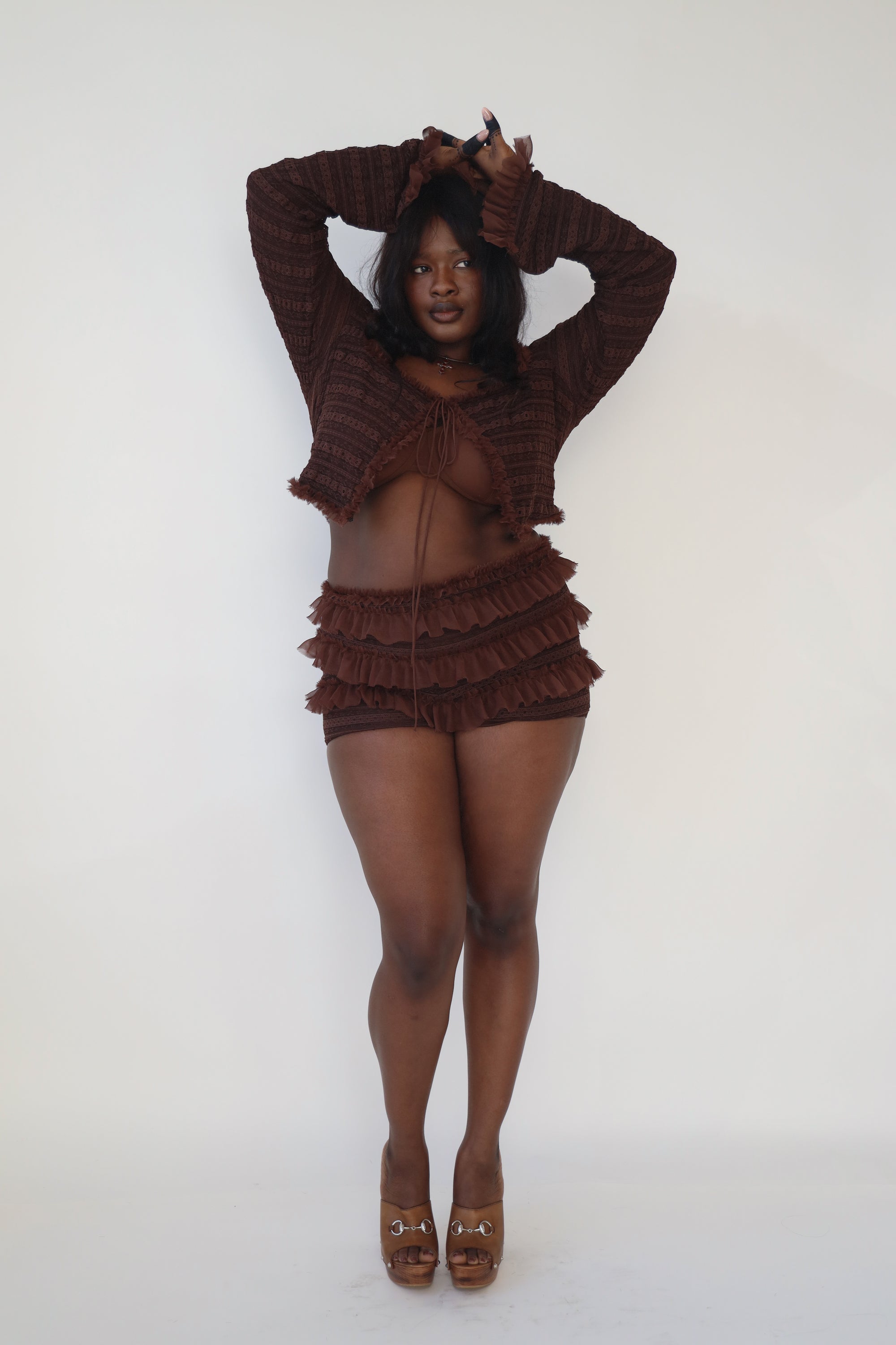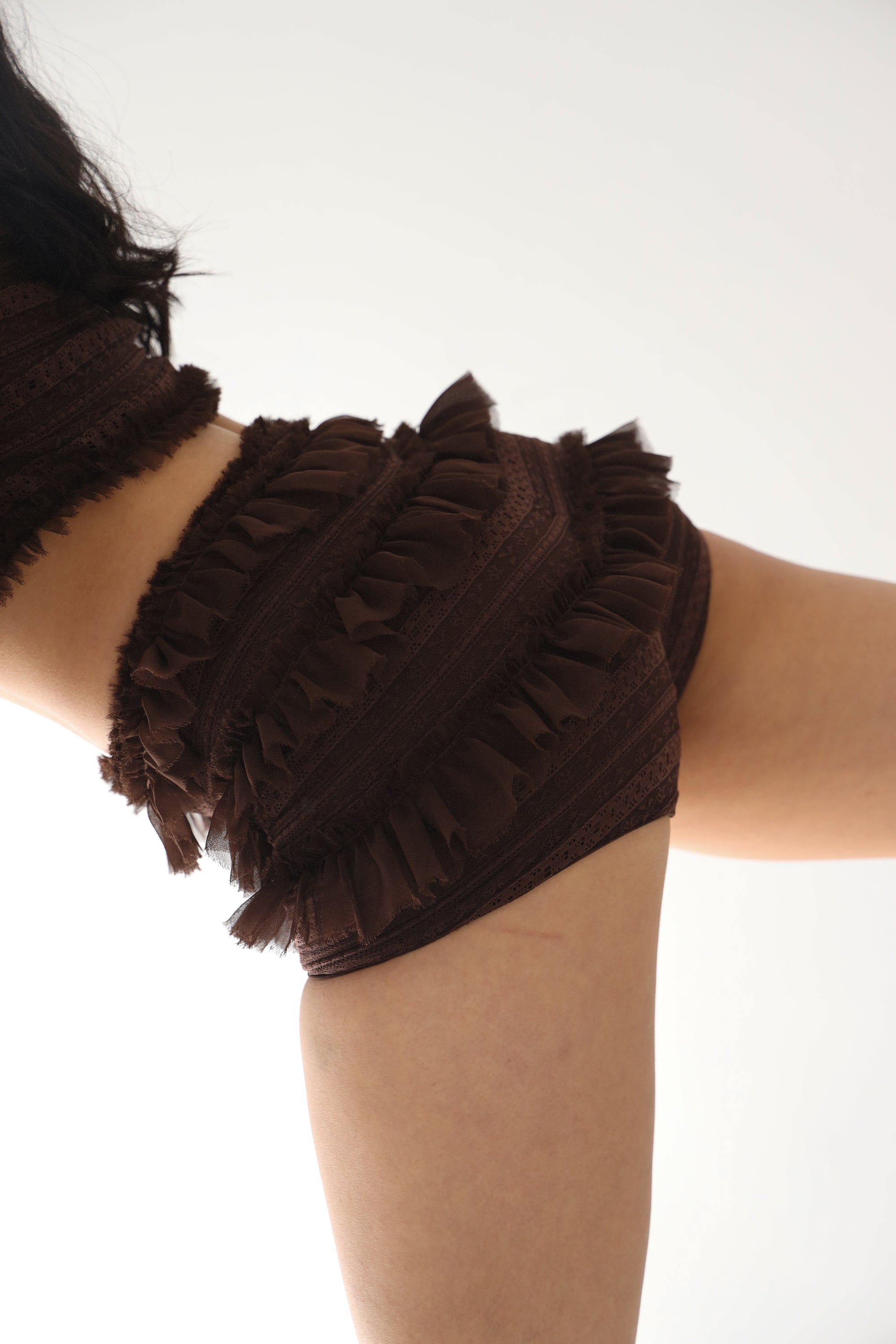 - Designed and proudly made in New York City, USA. Crochet lace pull on bloomer with silk chiffon ruffles. Stretch fabric with elastic waist. Also available in Shell.