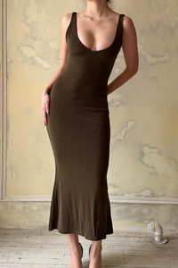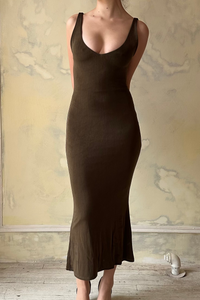 - Designed in New York. Stretch midi dress with v-neck front and deep v-neck in the back. Slinky fabric stretch dress with firm stretch power mesh lining. Sample Sale Items are Final Sale. No refunds or exchanges will be offered, no exceptions. Condition: sample color (no damage).