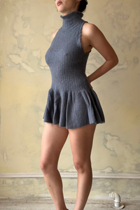 - Unreleased style. Grey knit sleeveless mini dress with mock neck. Sample Sale Items are Final Sale. No refunds or exchanges will be offered, no exceptions. Condition: In good condition, slightly stretched out and hole on under arm.
