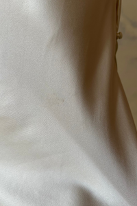 - Designed and proudly made in New York City, USA. The Plunging Back Cowl Mini Dress is made in crepe back satin and has French Seams. Ties at shoulders; cover buttons with loops at the cowl. Shop all Plunging Back Cowl colorways here. Sample Sale Items are Final Sale. No refunds or exchanges will be offered, no exceptions. Condition: In okay condition, tiny snags and faint small stains throughout