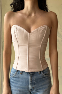 - Designed in New York. Silk taffeta corset with boning throughout, poly taffeta loops, silk charmeuse ties and smocked back. Also available in Noir. Sample Sale Items are Final Sale. No refunds or exchanges will be offered, no exceptions. Condition: In good condition with slight bending to the boning and faint tiny stains.